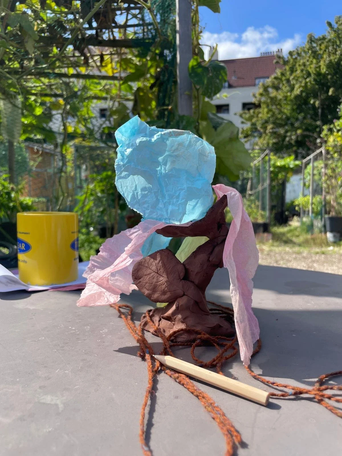 In the next part of the workshop we explored what values are most needed when co-creating spaces with young people. Each person chose a value and did freefall writing, otherwise known as writing without a parachute, to dig into the inquiry further. They shared this in small groups and worked together to create their own stories through the use of clay, paints, crayons and recycled materials. The creative outputs were beautiful and varied, from having a recipe for co-creation to a sculpture to an immersive installation.