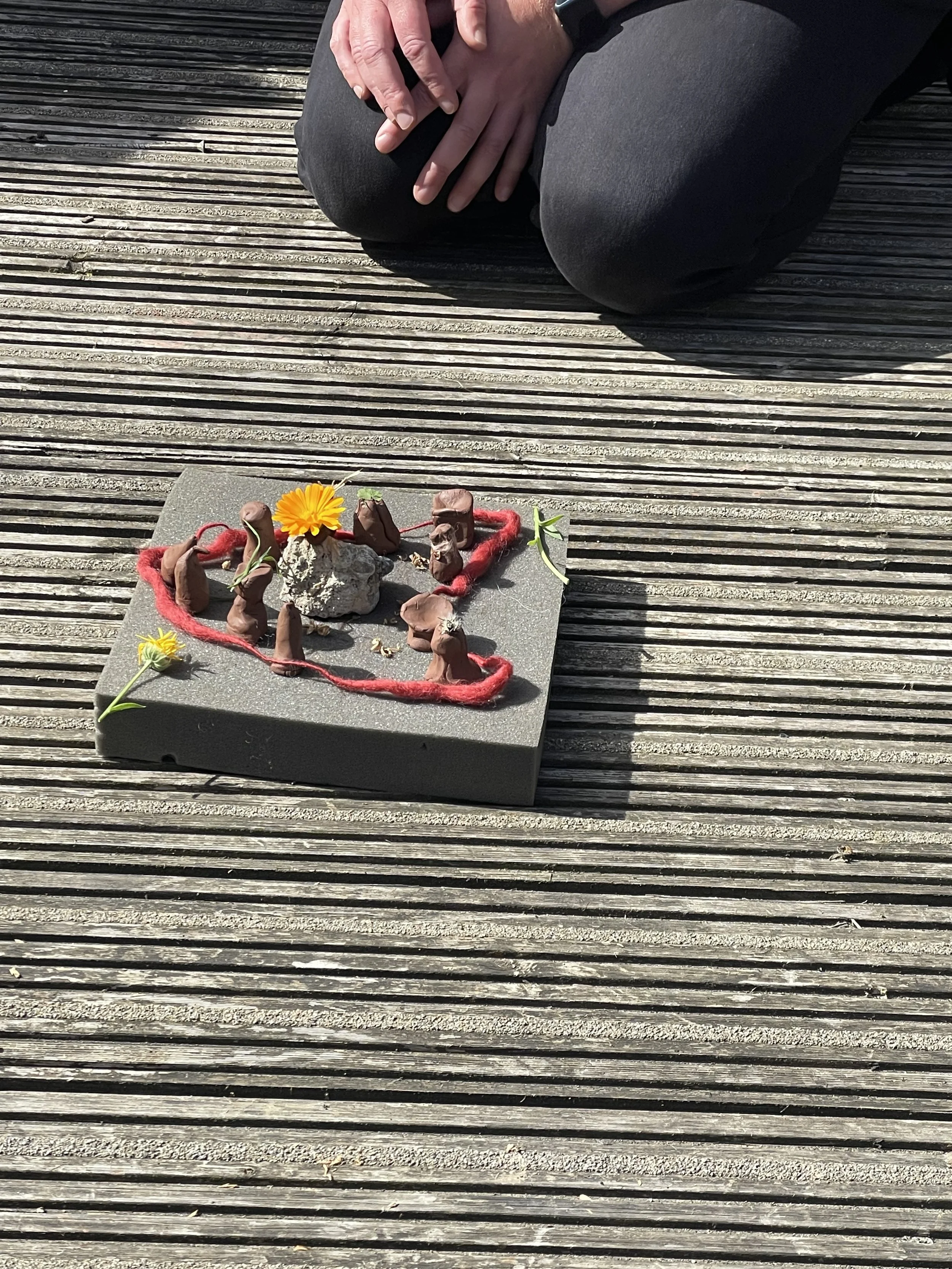 We then went out into the garden each doing mindful walking to connect with ourselves and with the natural world around us. Everyone found an object in nature which represents the purpose of their role in working with children and young people. Through a sharing circle we heard everyone’s individual purpose and created a piece of collective land art bringing everyone’s objects and purposes together, seamlessly feeling the interconnection between each other and the meaning behind the work that we do.
